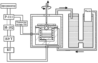 Fig.1. Block diagram of a growth setup with temperature stabilization (a) and (b) grown LiNbO3 crystal.